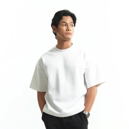 - Cutting modern boxy fit (badan lebih lebar, jatuh rapi)